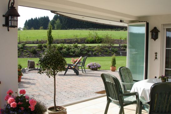 La paroi coulissante-pivotante entièrement vitrée ou avec encadrement aluminium vous offre encore plus de place lors de son ouverture totale.